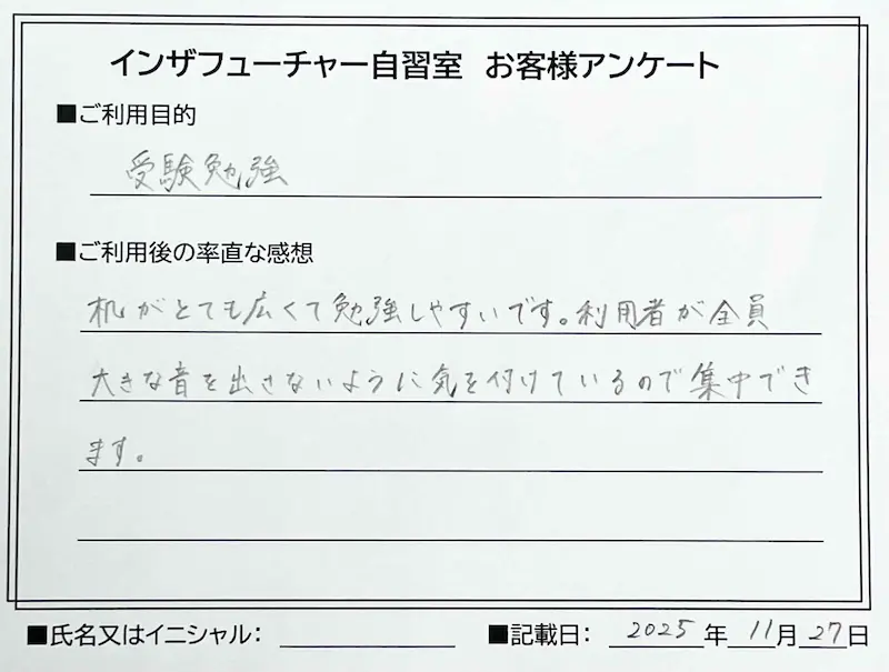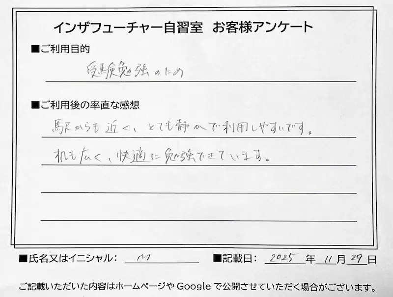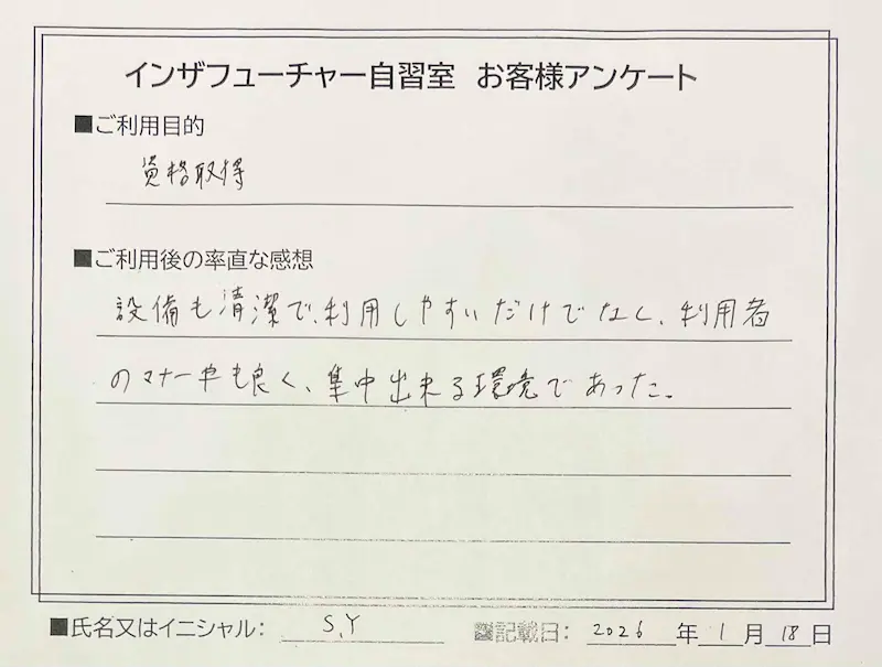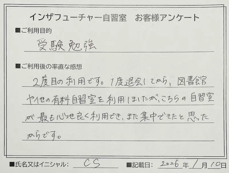 大学を受験する予備校生・高校生、医師国家資格を目指す大学生、資格取得を目指す社会人・主婦、語学勉強をする社会人の方などがご利用されています。皆さん、静かな環境で、集中して勉強したい人たちばかりです。