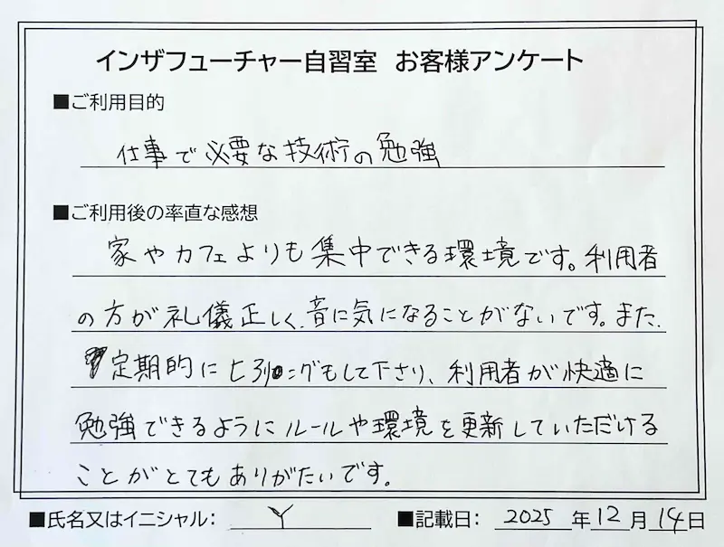 無料体験のあと「ここで勉強してみたい」そう思ったら入会のご希望をお伝えください。安心と静かさを維持するため”利用ルールのご説明”と、ご利用目的等をお聞きする”ご面談”を行います。